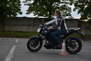 „Přece si netrhnu ostudu se svým BMW F 800 GS, já která píšu testy, mám plno letitých zkušeností a pak si ustelu na cvičišti a ještě k tomu se svým bikem, kterého znám jak svoje boty?“ Tak jsem pořád dokola odsouvala předem dohodnutý trénink s Petrem, než přišla ta pravá motorka, Yamaha MT-03. Už od prvního kilometru v jejím sedle jsem věděla, že tohle bude ten správný stroj na cvičiště. A byl! Osmičky, slalom, otáčení do protisměru, to vše zvládala výborně. Tím nechci říct, že to bylo jednoduché, naopak, některé úkoly byly docela těžké, ale přece jenom se s tímto lehkým bikem daly zvládnout.