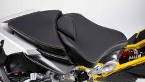 Přední dvanáctipalcové kolo a zadní třináctka jsou obuty na pneumatikách Pirelli Diablo Rosso. Podvozek si můžete vyladit k obrazu svému díky stavitelnému odpružení. Trubkový rám je stejně jako jednostranná kyvná vidlice a několik dalších komponent vyroben z hliníku. O bezpečné zastavení se vám postarají kotoučové brzdy, vpředu je o průměru 175 mm, vzadu 240 mm. Do nádrže se vám vejde 9 litrů paliva, kolik na ni však ujedete kilometrů, to bude záležet hlavně na tom, jak dokážete krotit svoje emoce po prvním zabrnknutí na plynovou rukojeť.
