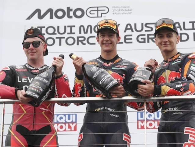 Novopečený mistr světa Moto3 Jose Antonio Rueda vyhrál úvodní závod na Phillip Islandu a překazil tak domácímu publiku radost z vítězství, když lokalmatador Joel Kelso byl odmávnut v cíli na druhém místě. Stupně vítězů doplnil Alvaro Carpe a zajistil tak pro KTM další hattrick.